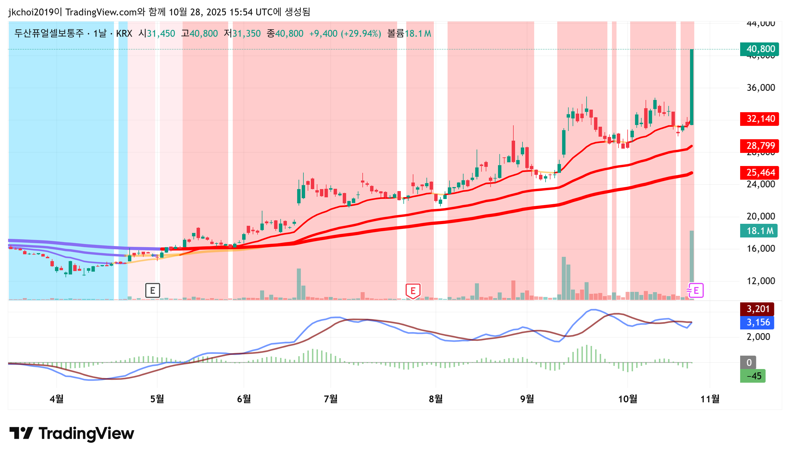 오늘 두산퓨얼셀 주가, 이동평균선 위에서 아주 굳건하게 버티고 있네요. 종가 40,800원은 20일선 대비 +29.9%, 60일선 대비 +55% 이격! 과열 신호지만, 추세는 여전히 강력해요.