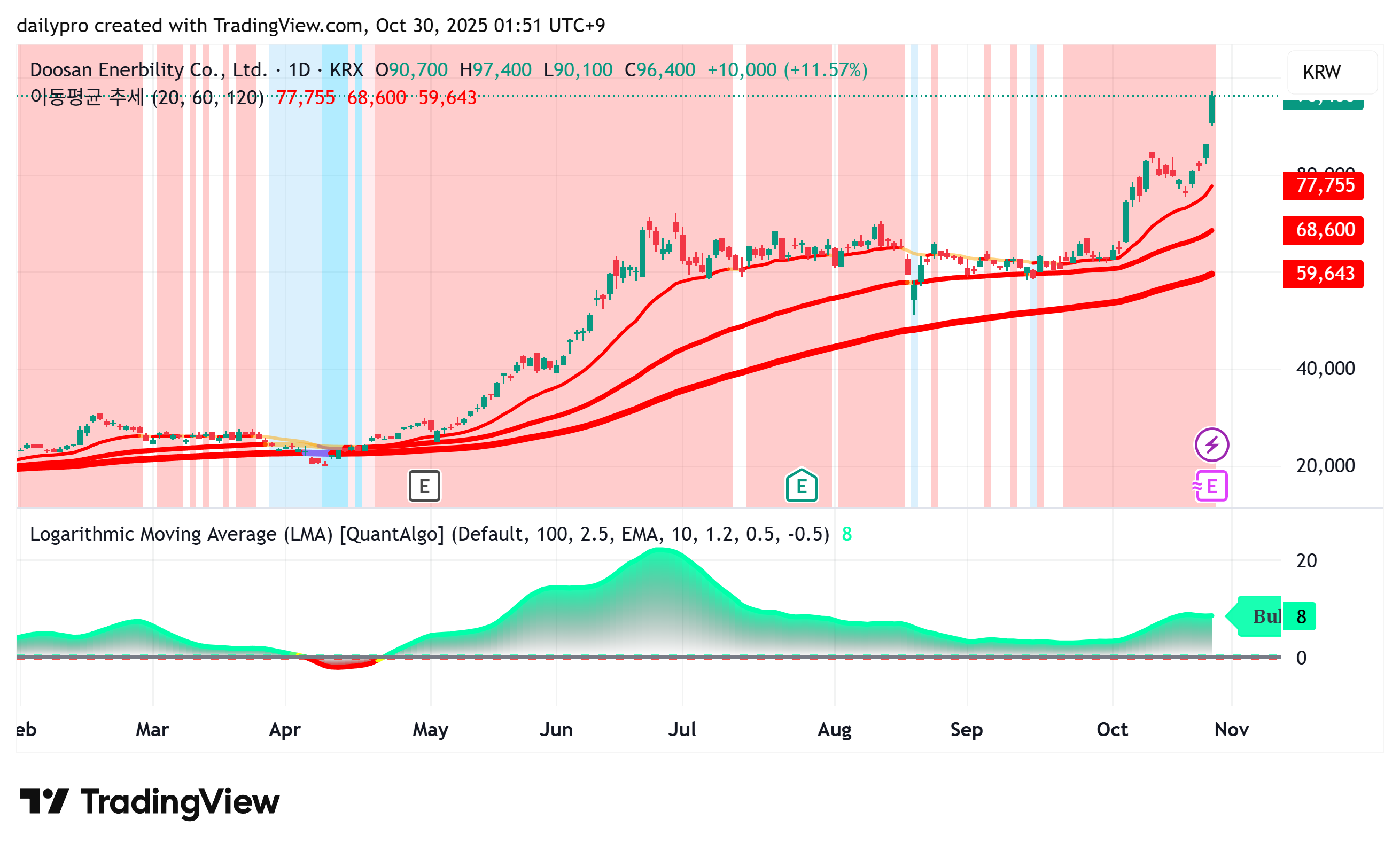 두산에너빌리티 주가, 정배열 상태로 강한 상승 추세 확인. 📈