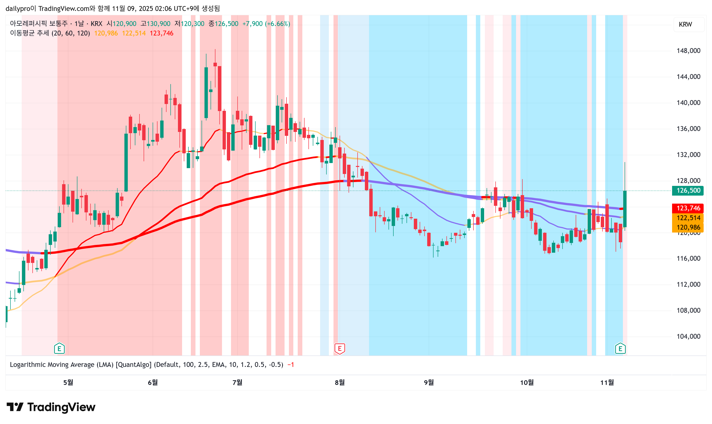 이동평균선, 주식 투자할 때 꼭 봐야 하는 거죠? 😊 오늘 아모레퍼시픽 주가, 20일선 위에서 아주 굳건하게 버티고 있네요. 최신 종가 126,500원이 20일 MA(120,015원) 대비 +5.4% 위에 위치해요. 60일 MA(118,472원)와의 거리는 +6.8%로, 꽤 여유롭습니다.
