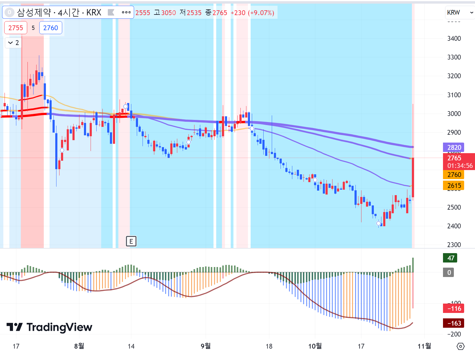먼저, 우리는 삼성제약 주식의 최신 종가를 확인합니다. 2,535원으로 시작합니다. 그러나 이 종가가 이동평균선들과 어떻게 관련되는지 알아봐야 합니다.